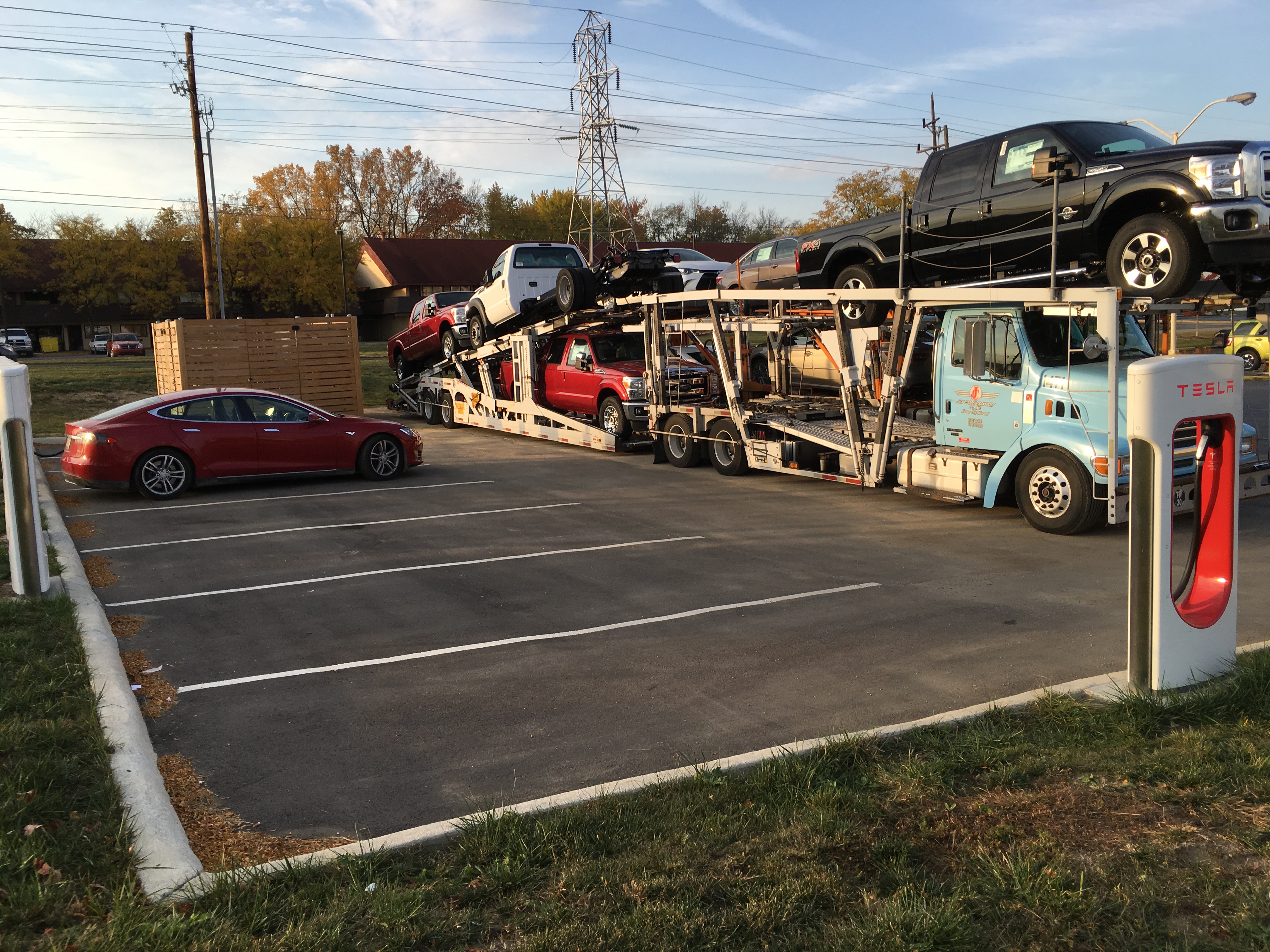 I get up and on the road, drive a ways and feeling hungry so I stop at the same Steak and Shake in Lafayette Indiana again while I am charging up. I wonder if the large blond Dr. Who fan lady will be there again, but she isn’t. Instead there is a nice Iranian or something related kind of lady, who also asks me where I come from like most people do. I go into the usual Nottingham, England, Robin Hood stuffs and then eat a burger and fries. Then I head off to the Indianapolis charger and there is a huge great truck loaded with pickups in front of it. There is a black Model S charging, and there is just enough room, with a few inches to spare, for me to get in so I can charge also. I back up and start charging and the lady in the Model S comes out to talk. She is tall, thin, short white hair, 40ish, attractive dressed in jeans and a tight top, very perky little boobs and very business like, I would guess an MD or something similarly professional. I look at the big truck and my first comment is “Assholes”. She says that was her first thought also. I ask her if she has some sticky notes that we may leave a suitably pithy message on the window of the truck, describing in some detail where we would like him or possibly her to place his or possibly her truck in future, though it likely would not fit. It’s annoying that for some reason he (most likely a he of course) deliberately blocked off the Tesla chargers when he (see previous bracketed comment) could have parked in plenty of other places without blocking off anybody. Maybe part of the backlash against rich eco freak tree hugger commie liberal types like me. Anyway she says no she has no stickies so that is no go. I make a mental note somewhere in my disturbed cortex that stickies would be a good thing to carry around in the car, then suggest that there might be one of those “how is my driving” things and a phone number on the back, but there isn’t. So anyway I take a cell phone picture of the truck and so does she, and she says she will send hers to Elon, who she may know for all I can tell. Then she takes off, possibly not quite sure if a slobby looking foreigner like me is safe, I don’t know. So I get a coffee etc., and look for truckers, but I don’t see any overweight middle aged stereotyped white men anywhere so I guess they are in the hotel or somewhere, either that or teenage girls can now be truckers, as there were several of those around. This seems unlikely so I don’t confront anybody and so head off to my friends place in Lexington, missing out the Cincinnati charger as I got enough charge in Indianapolis to get the whole way.