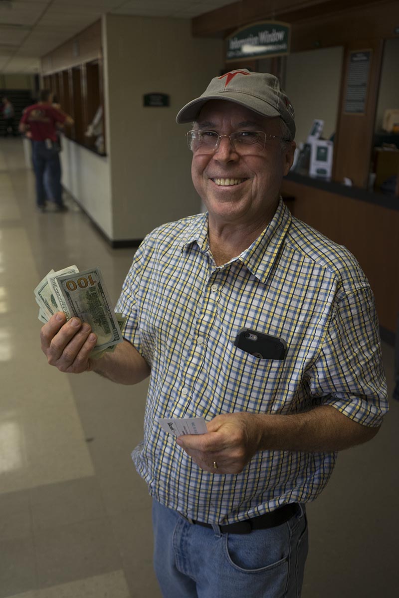 I go there and meet him, he looks a little older but healthy enough and I see his Tesla P85D, black and clean unlike my dirty 85D. He is in a cabin he is building on his farm, which is apparently 200 acres or so in Georgetown, the most horsey part of very horsey Kentucky. He takes me off to a big shed where he has a 40A Tesla charger thing and I plug my Tesla in, and then we go off to a restaurant, where we eat some stuff and I have a couple of beers. He has no beer which is perhaps more prudent as it is like 1:00 pm, but once again I can count on my superbly conditioned liver. He is into horses for some reason, so then we go to the Lexington racetrack horsey place and look at some horses and then we bet on them and then go to look at some races. I have no idea what is going on, all the horses look the same to me except some are very dark brown and some are more light brown, they all have 4 legs and a head at one end as far as I could see, and none are blue or purple which I would have noticed. So I bet randomly on horse things and I manage to win something somehow but then lose it all. John manages to win $300 plus though, and I get a picture of him with his winnings.