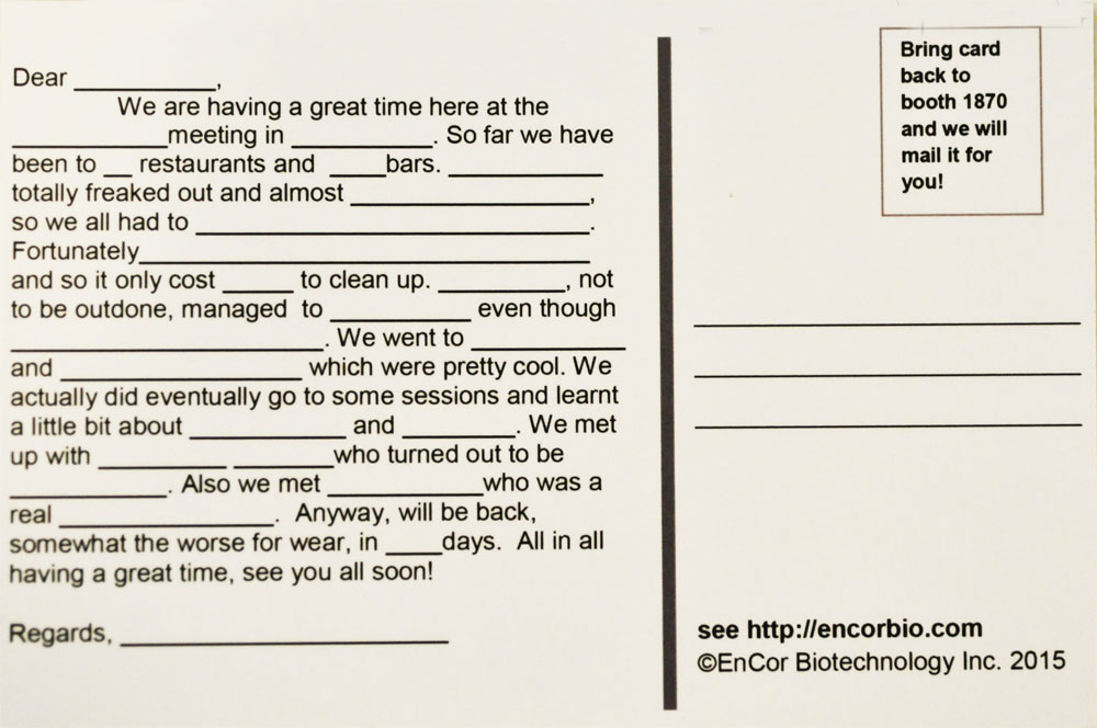The breakfast at the hotel looks good but is expensive and anyway I am not hungry so I don’t have any. There is really not too much point in eating anyway, you only get hungry again. I had got some stuff for the meeting shipped to the hotel and this has shown up, but it turns out to be quite a large heavyish box and I don’t feel like hauling that on the bus or train. Also I am not sure how to get my car out of the parking lot because of the ticket screw up thing. Also I got up a bit late, so it is about 9:00 and the booths are supposed to open at 9:30, so I get a taxi to the convention center. The taxi driver is one of those not interested much in yaking so after a few attempts to converse about the weather and Rahm Emanuel I just look out the window. The booths have just opened when I get there, and I am at mine continuously from then to 5:00 with basically no breaks. Perhaps I should briefly describe one of these big science meetings for those of you who have never been to one. Basically about 30,000 people show up for an intense 4 day meeting which has talks about all kinds of things going on in lots of different rooms all at the same time, usually presented by professors and more senior researchers. These run over the entire 4 days of the meeting so there are thousands of talks you could go to if you could be in dozens of different places at once. There are also poster sessions where usually the younger scientists present data on poster boards and have to answer questions on whatever it was they were (or were not) doing. The posters are changed during the day so there are eight different poster sessions over 4 days meaning that several thousand posters get presented. Finally, and lowest on the academic totem pole, are the exhibitors, who are there for the entire meeting, sitting at a booth and trying to attract attention to whatever goods or services they have. Some of these end up being sort of sad, people sitting there for days with hardly anyone taking any notice of them. As I noted this is the third time I was in the low totem pole group, having deteriorated from someone who gave talks or at least a poster or two to now become a booth exhibitionist. So I noted that you have to have a striking booth and give out a lot of free stuff to get noticed. I have been showing pictures of brain cells made using my company reagents which seemed to go well and I also give out nice pens, flashlights, postcards, memory cards, tool things and other nonsense, in fact way too much nonsense. Often people come by the booth, grab hand fulls of goodies and take off, showing no interest at all in what my company is doing. Having one of these booths is fairly serious, the cheapest and smallest being over $4,000 to rent and then you have to pay extra for the carpet, desks, chairs and then you have ship your free stuff, catalogs whatever, pay for your companies travel, hotels, food, drink etc., so even a small company is going to be investing something well north of $10,000. In general these meetings get to be very tiring but usually a lot of fun. The older guys meet lots of people they used to work with, or their former students or employees or whatever, so they end up bullshitting a lot in bars and restaurants. The younger people, the students and postdocs, have a great time, being let loose often with their friends in some big city with somebody else paying and there are epic stories of booze ups, misadventures, total screw ups, sex, drugs and rock and roll and other hilarious episodes. In fact here is the easy to complete postcard my company gives out to graduate students and postdocs so they can document their various misadventures with little effort on their part, we even gave them free stamps.
